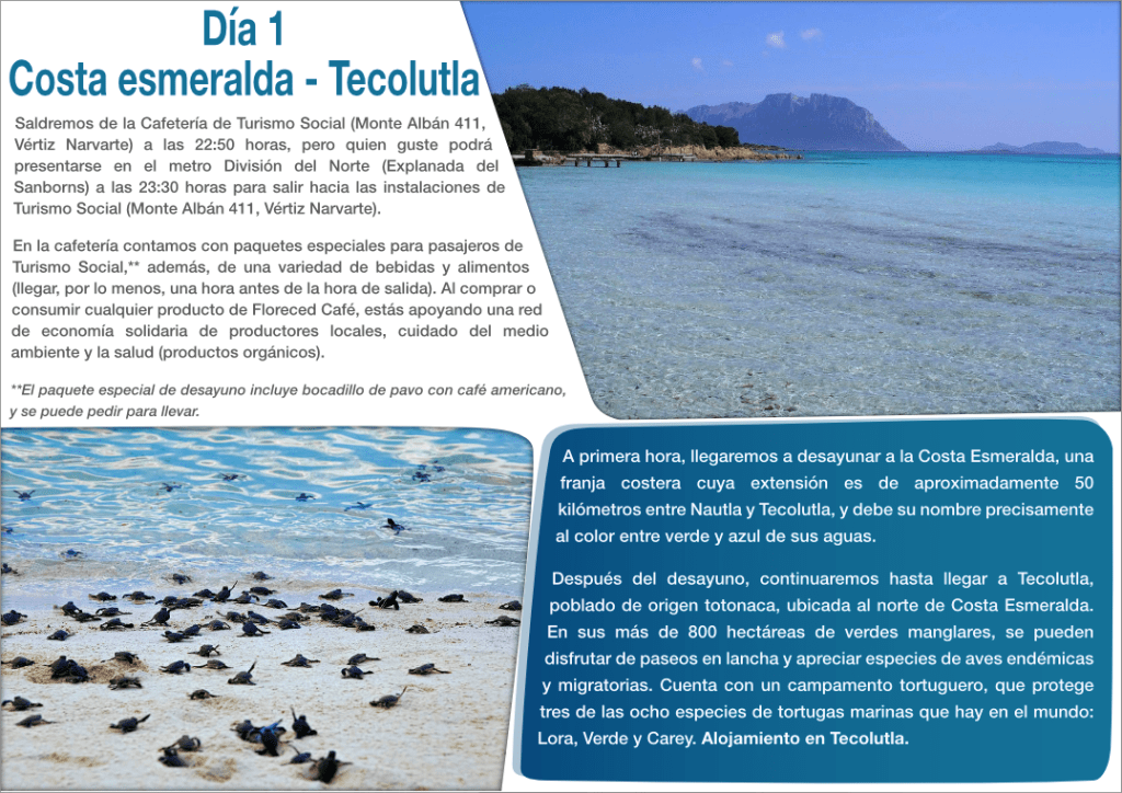 A primera hora, llegaremos a desayunar a la Costa Esmeralda, se trata de una franja cuya extensión es de aproximadamente 50 kms. entre Nautla y Tecolutla, y debe su nombre precisamente al color entre verde y azul de sus aguas.