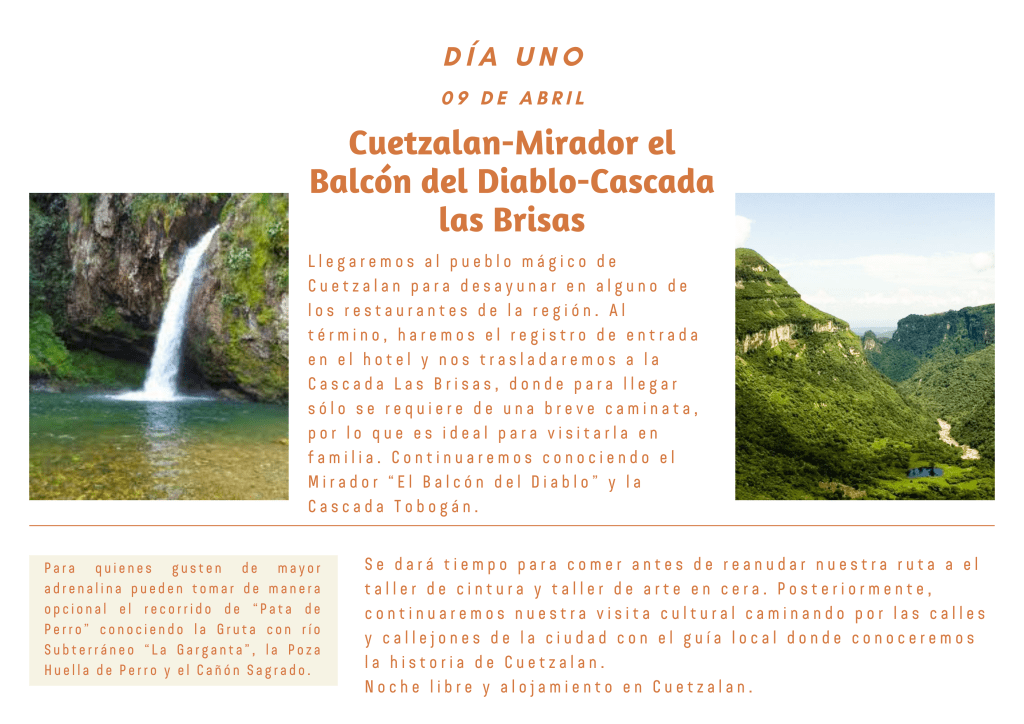 Llegaremos a primera hora de la mañana para desayunar en un lugar de la región. Al término, haremos registro de entrada en el hotel e iniciaremos nuestros recorridos. Quienes deseen caminar poco, se trasladarán a la Cascada Las Brisas (cuya caída forma un estanque para nadar), continuando con un mirador llamado, El Balcón del Diablo, y terminando con la Cascada Tobogán. Sin embargo, para quienes disfrutan las caminatas, se ofrece el recorrido opcional de “Pata de Perro” conociendo una gruta con río subterráneo llamada, La Garganta, seguida de la Poza Huella de Perro y el Cañón Sagrado.
