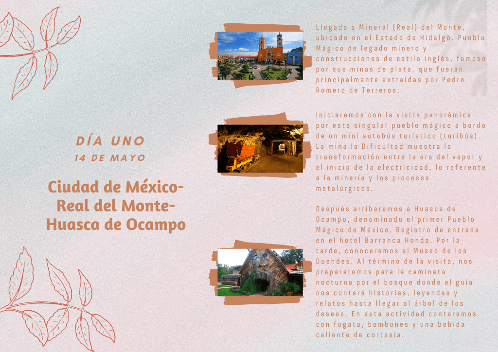 Después arribaremos al Huasca de Ocampo, denominado el primer Pueblo Mágico, que conquista por sus ex haciendas, sus historias de duendes y su compleja belleza natural. Registro de entrada en el hotel Barranca Honda que cuenta con albercas, áreas verdes, juegos infantiles y zona de asadores (que pueden usarse grupal e individualmente) otra opción para comer es disfrutar del restaurante del hotel. Por la tarde conoceremos el Museo de los Duendes, único en su tipo. Al término de la visita, nos prepararemos para la caminata nocturna por el bosque donde el guía nos contará historias, leyendas y relatos hasta llegar al árbol de los deseos. En esta actividad contaremos con fogata, bombones y una bebida caliente de cortesía.