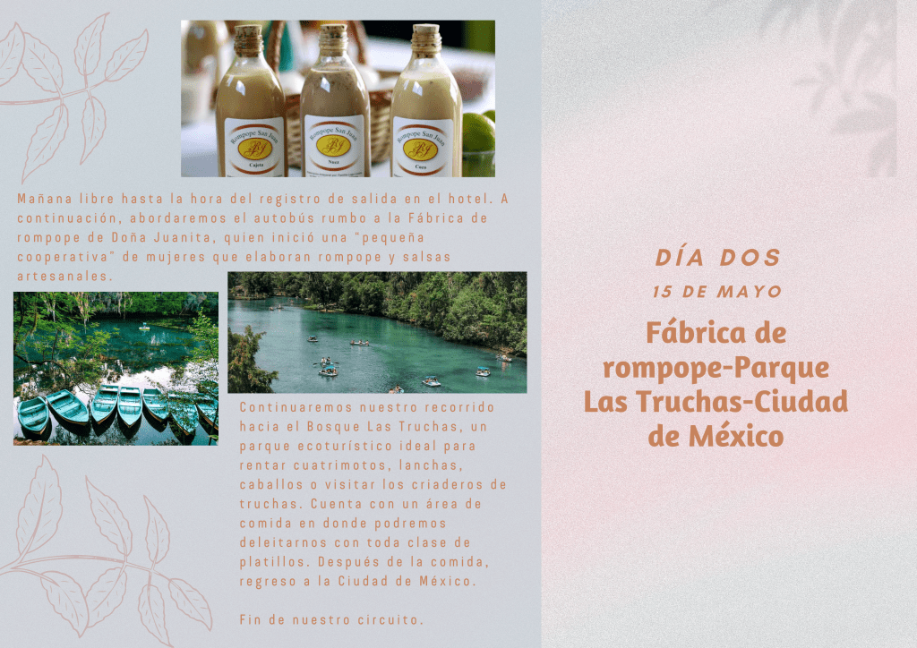 Mañana libre hasta la hora del registro de salida del hotel. A continuación, abordaremos el autobús rumbo a la Fábrica de rompope de Doña Juanita, ella fue quien inició una “pequeña cooperativa” de mujeres que elaboran rompope y salsas artesanales. En este lugar sorprende la calidez de la atención personalizada para degustar los productos que ellas mismas elaboran. Continuaremos nuestro recorrido hacia el Bosque las Truchas, un parque ecoturístico ideal para rentar cuatrimotos, lanchas, caballos o visitar los criaderos de truchas, cuenta con dos albercas al aire libre y un área de comida típica del lugar donde podremos deleitarnos con toda clase de platillos.