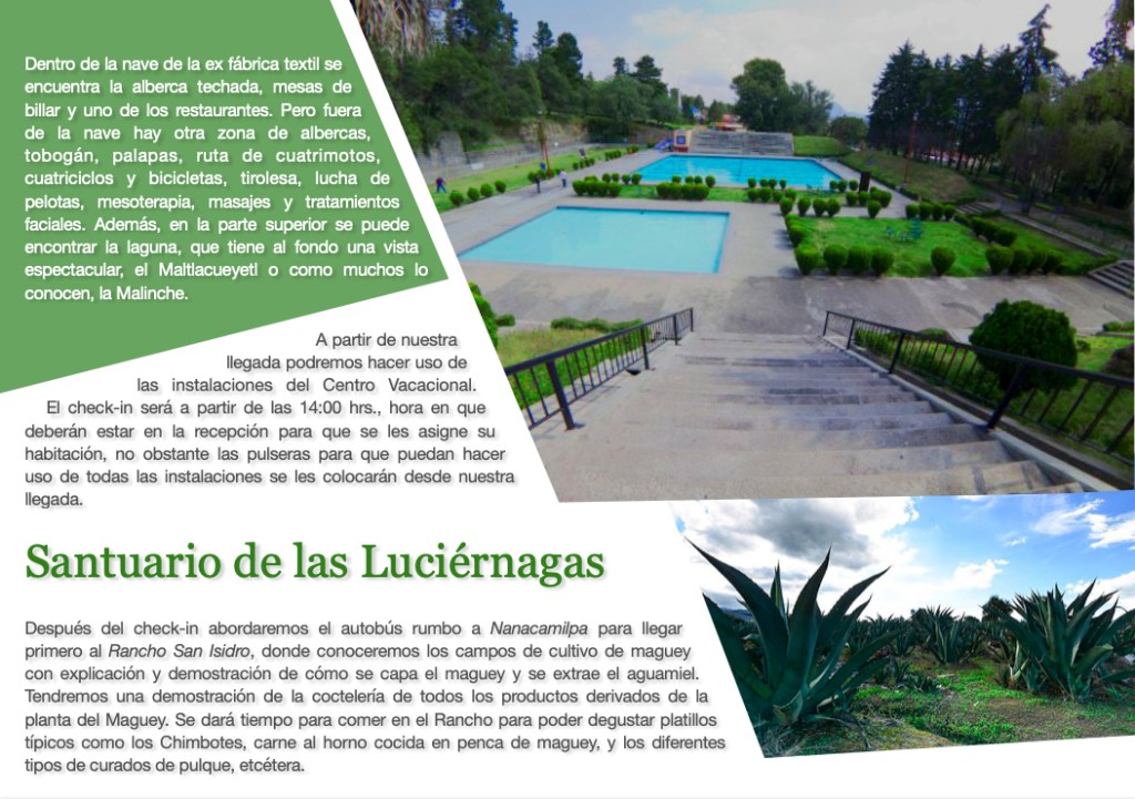 Iniciaremos nuestro camino hacia el Centro Vacacional La Trinidad, ubicado en el estado de Tlaxcala. Se trata de un enorme conjunto levantado sobre una ex fábrica de hilados (una de las más grandes y antiguas del país), que actualmente cuenta con cinco hoteles, un balneario de aguas termales (con albercas techadas y albercas al aire libre), museo, una capilla que no ha tenido modificaciones desde que fue construida, canchas de tenis, fútbol rápido, básquetbol y laberinto de arbustos. Además, en la parte superior se puede encontrar la laguna, que tiene al fondo una vista espectacular, el Maltlacueyetl o como muchos lo conocen, la Malinche.