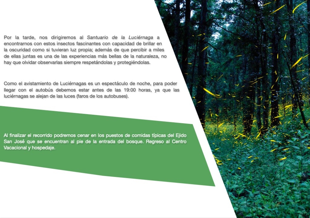Finalizando el recorrido, nos dirigiremos al Santuario de la Luciérnaga a encontrarnos con estos insectos fascinantes con capacidad de brillar en la oscuridad; además de que percibir a miles de ellas juntas es una de las experiencias más bellas de la naturaleza, no hay que olvidar observarlas siempre respetándolas y protegiéndolas. Como el avistamiento de Luciérnagas es un espectáculo de noche, para poder llegar con el autobús debemos estar antes de las 19:00 en el lugar, ya que las luciérnagas se alejan de las luces (faros de los autobuses).