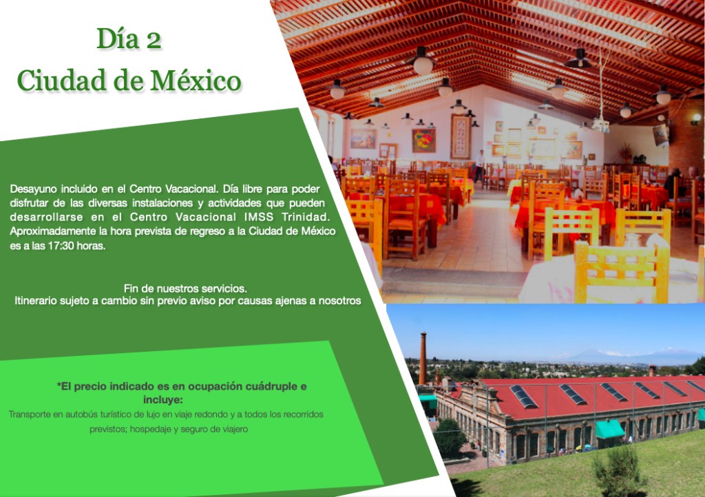Desayuno incluido en el Centro Vacacional. Día libre para poder disfrutar de las diversas instalaciones y actividades que pueden desarrollarse en el Centro Vacacional IMSS Trinidad. Aproximadamente, la hora prevista de regreso a la Ciudad de México es a las 17:30 horas.