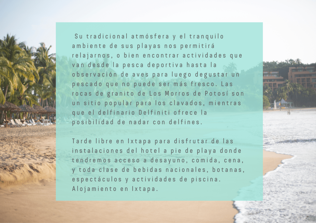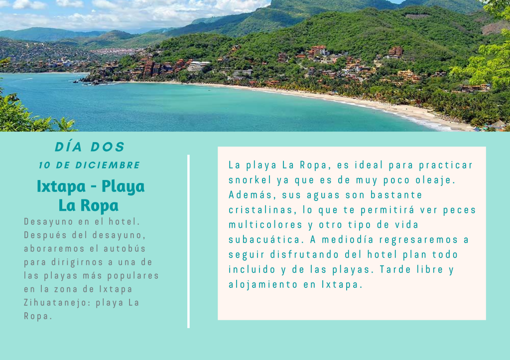 Desayuno en el hotel. Después del desayuno, aboraremos el autobús para dirigirnos a una de las playas más populares en la zona de Ixtapa Zihuatanejo: playa La Ropa, ideal para practicar snorkel ya que es de muy poco oleaje. Además, sus aguas son bastante cristalinas, lo que te permitirá ver peces multicolores y otro tipo de vida subacuática. A mediodía regresaremos a seguir disfrutando del hotel plan todo incluido y de las playas. Tarde libre y alojamiento en Ixtapa.
