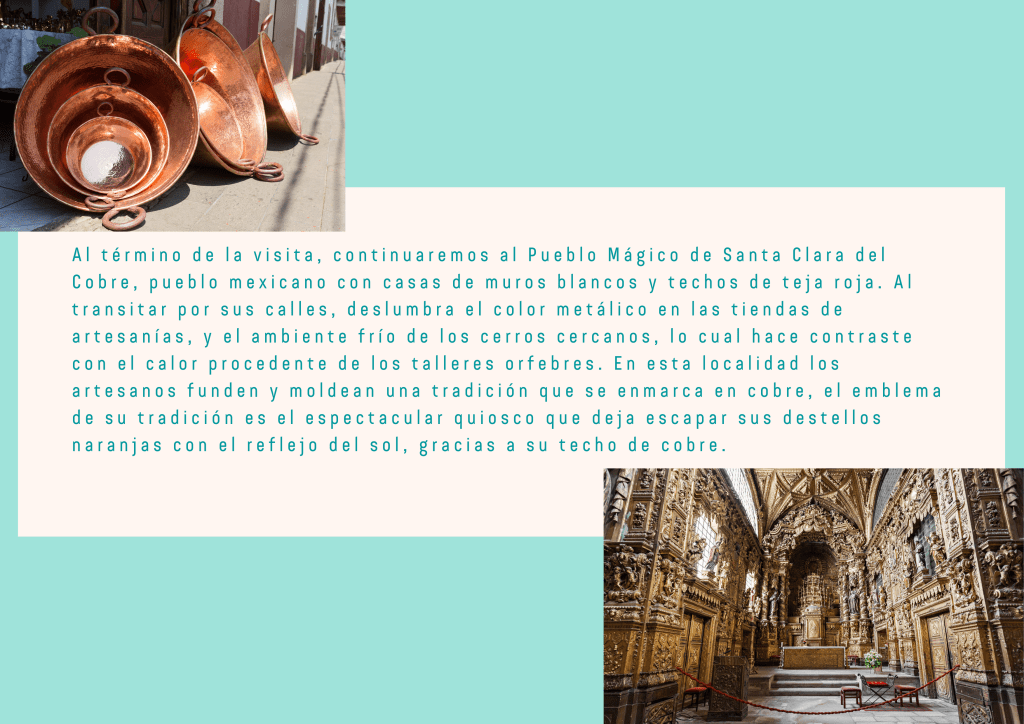 Al término de la visita, continuaremos al Pueblo Mágico de Santa Clara del Cobre, pueblo mexicano con casas de muros blancos y techos de teja roja. Al transitar por sus calles, deslumbra el color metálico en las tiendas de artesanías, y el ambiente frío de los cerros cercanos, lo cual hace contraste con el calor procedente de los talleres orfebres.