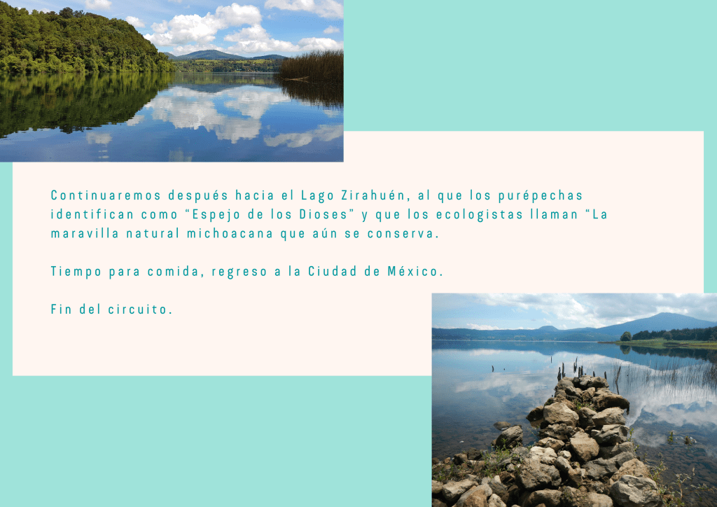 Continuaremos después hacia el Lago Zirahuén, al que los purépechas identifican como “Espejo de los Dioses” y que los ecologistas llaman “La maravilla natural michoacana que aún se conserva”.