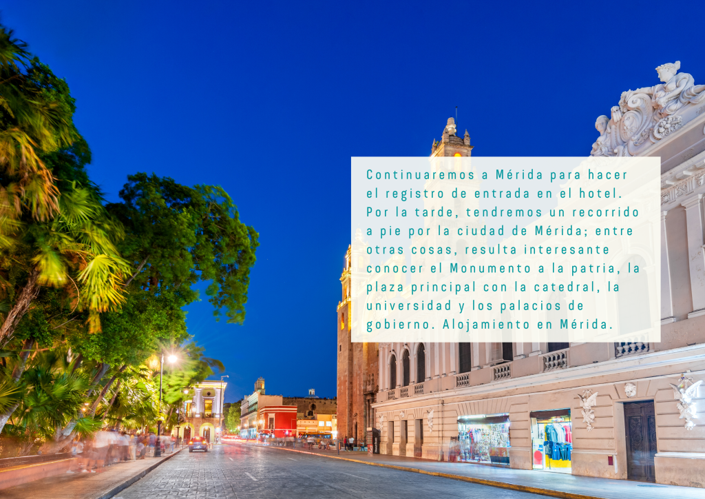 A la hora indicada, presentarse en el aeropuerto para tomar el vuelo rumbo a la ciudad de Mérida.