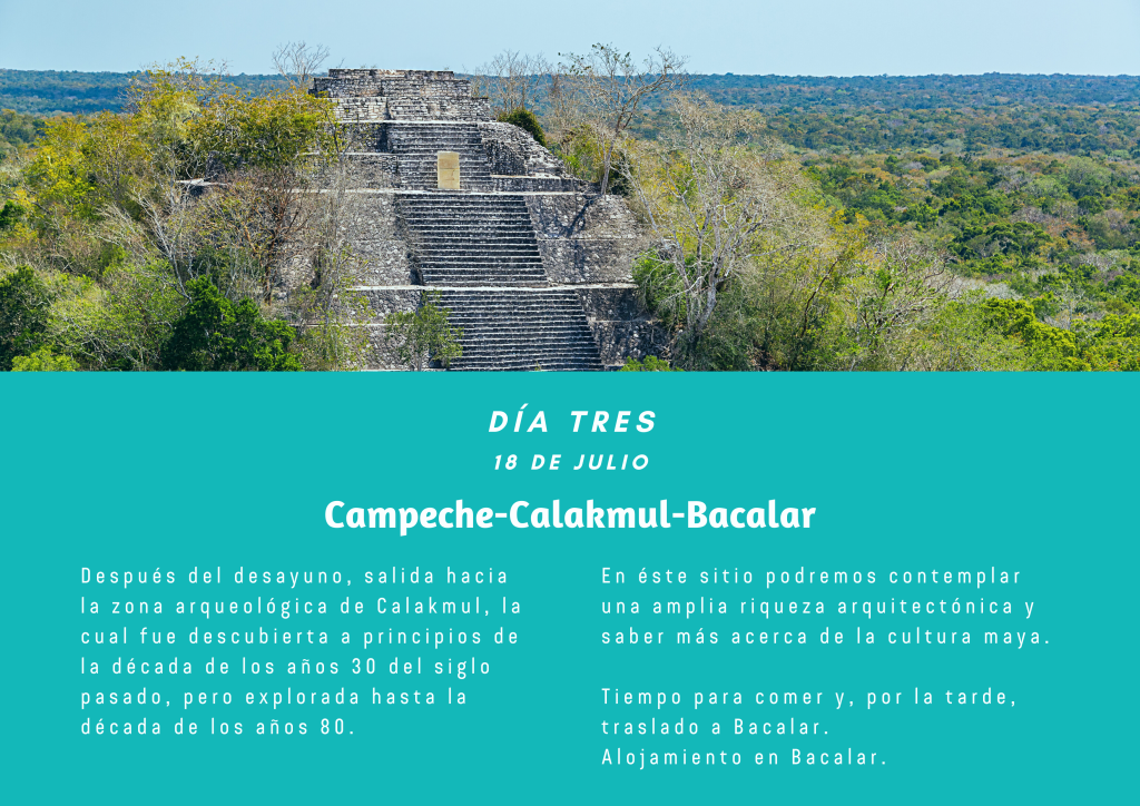 Después del desayuno, salida hacia la zona arqueológica de Calakmul (302 kilómetros, 5 horas aproximadamente), la cual fue descubierta a principios de la década de los años 30 del siglo pasado, pero explorada hasta la década de los años 80. En éste sitio podremos contemplar una amplia riqueza arquitectónica y saber más acerca de la cultura maya, además podremos reflexionar sobre los limitados recursos que históricamente el gobierno destinó a la exploración arqueológica Maya, así como al desarrollo de la infraestructura que permitiera un mejor flujo turístico en beneficio de las poblaciones locales. Tiempo para comer. Por la tarde, traslado a Bacalar. Alojamiento en Bacalar.