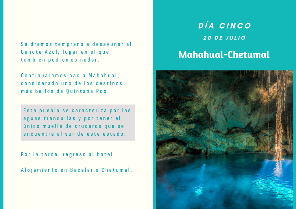 Mérida; Las Coloradas; Zona Arqueológica de Uxmal; Campeche; Zona Arqueológica de Calakmul; Bacalar; Cenote Azul; Mahahual y Chetumal
