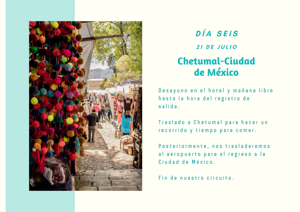 Desayuno en el hotel y mañana libre hasta la hora del check out. Traslado a Chetumal para hacer un recorrido y tiempo para comer. Posteriormente, nos trasladaremos al aeropuerto para el regreso a la Ciudad de México.