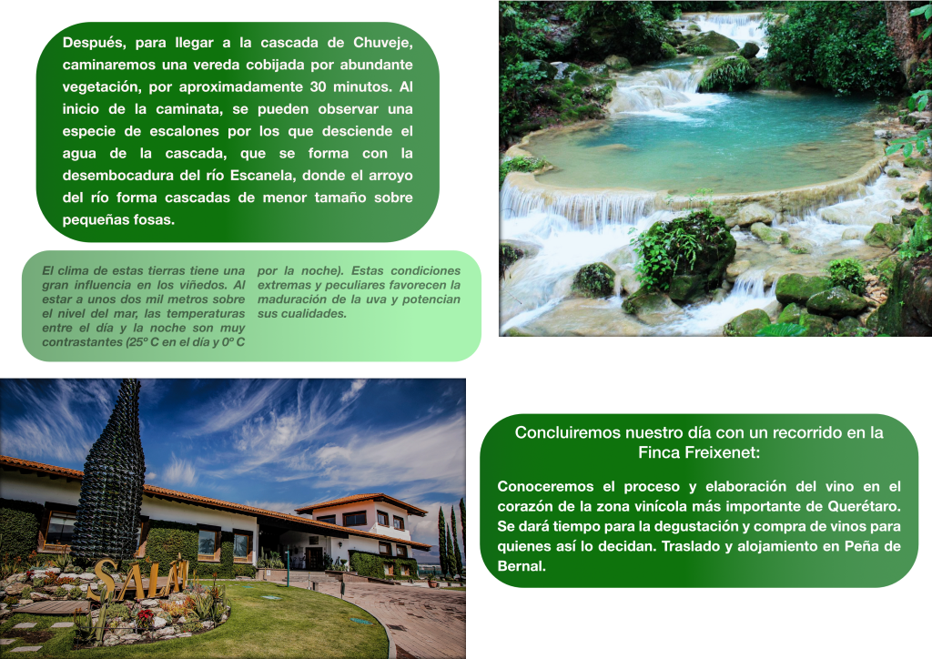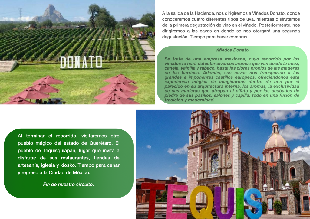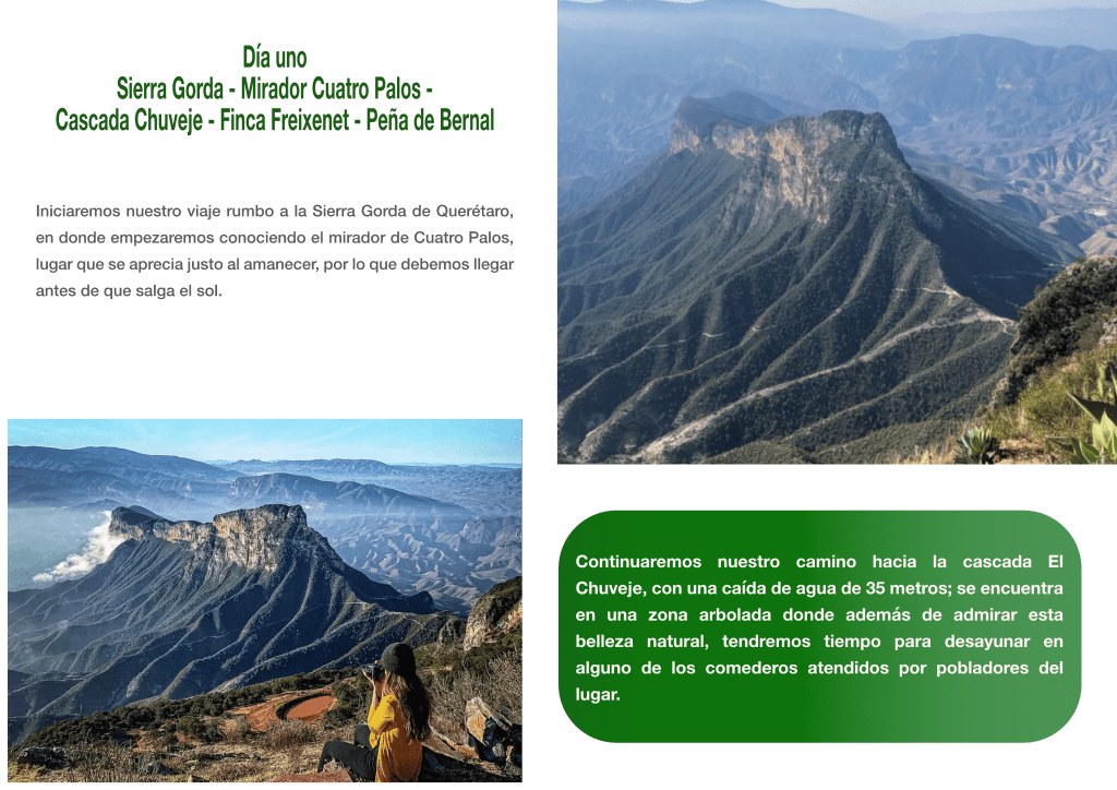Sierra Gorda; Mirador Cuatro Palos; Cascada Chuveje; Peña de Bernal; Tequisquiapan; Rancho quesero Flor de Alfalfa; Cavas Freixenet; Viñedos Donato