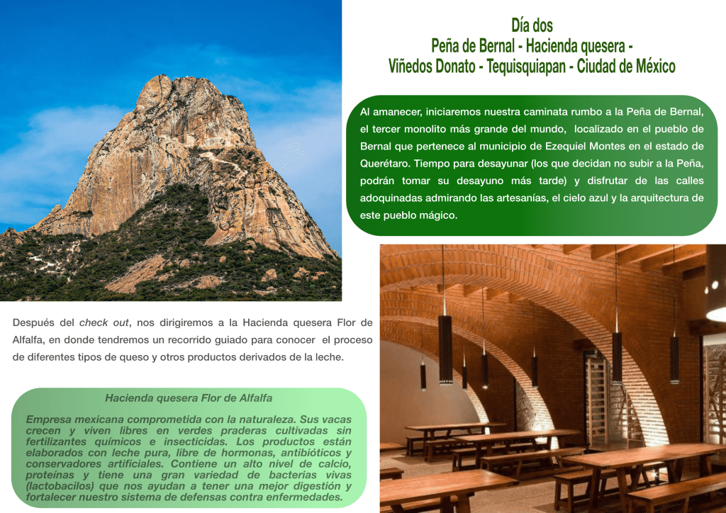 Peña de Bernal – Hacienda quesera Flor de Alfalfa – Viñedos Donato – Tequisquiapan – Ciudad de México